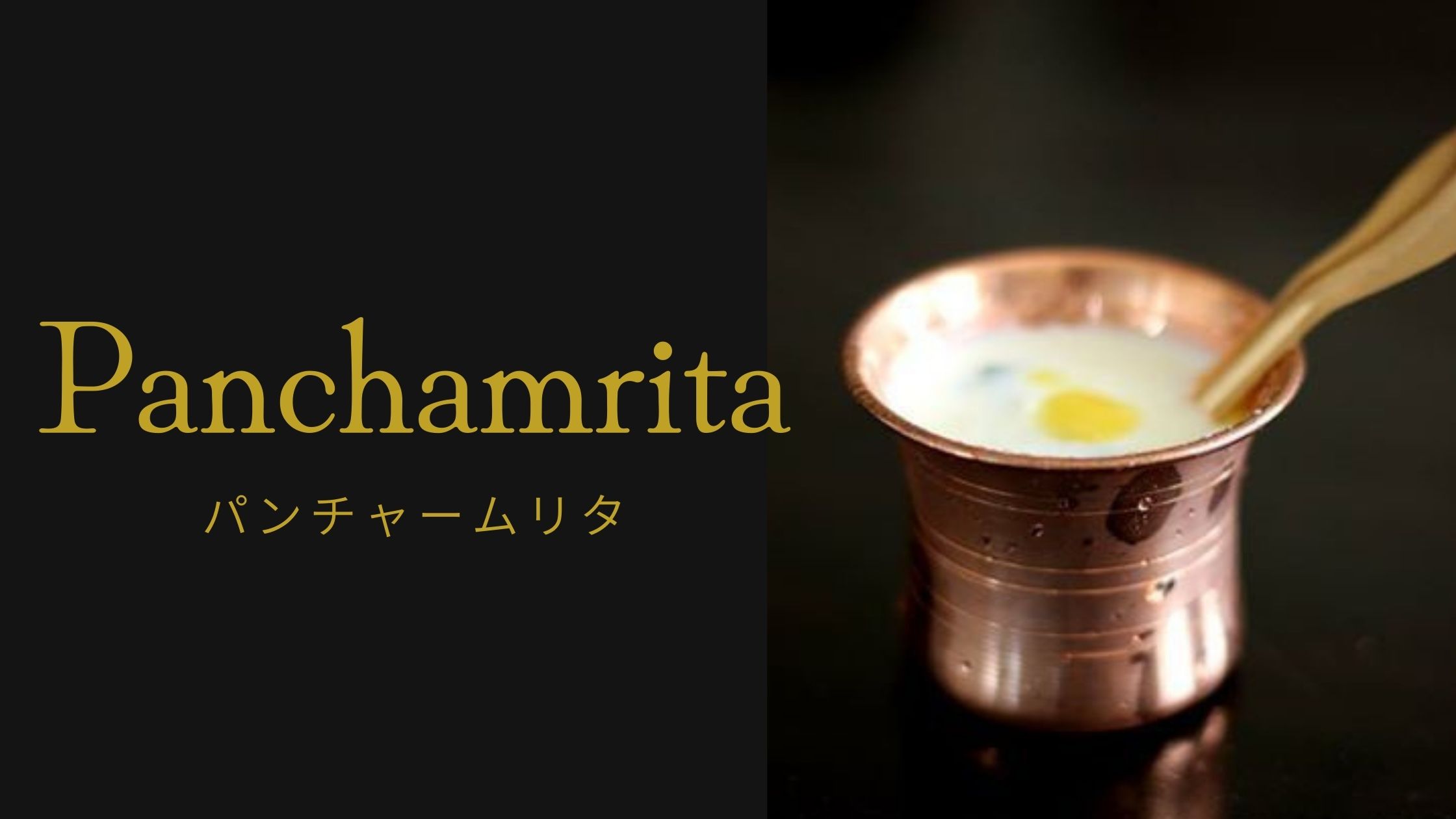 アムリタ=甘露、ネクター は、古代インド神話に出てくる不老不死の妙薬です。身体を蘇らせ、心を若々しくするものです。 パンチャアムリタは5つの優れたエネルギーを持つ食材(牛乳、ヨーグルト、ギー、蜂蜜、砂糖)で作られ、現在でも寺院における儀式の際に祭壇に捧げられるものでもあり、アーユルヴェーダの文献にも登場する滋養の飲み物です
